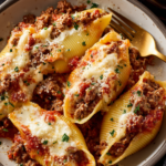 A comforting baked pasta dish made with tender jumbo shells, savory beef, and a creamy ricotta-based filling, finished with marinara sauce and melted cheese.