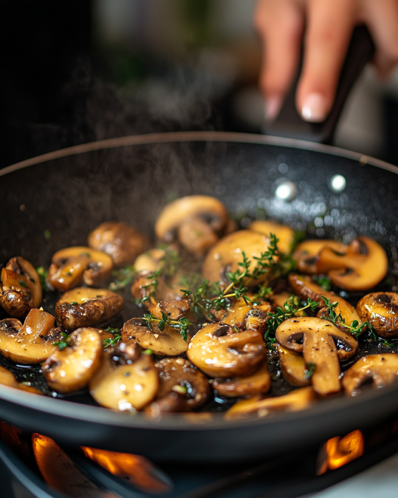 - Cook the mushrooms: Add the sliced mushrooms and thyme to the skillet. Sauté until the mushrooms release their juices and start turning golden brown. Season with salt and pepper to taste. The mushrooms should have a rich, earthy aroma by this stage.