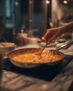 Olive oil helps build the flavor base, carrying the aroma of onion and garlic. These aromatics create the foundation of the sauce, releasing sweetness and warmth as they cook.