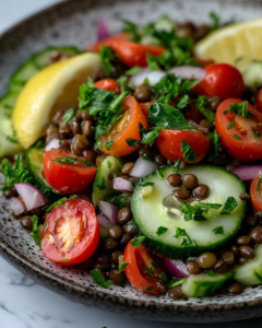 A fresh, protein-packed lentil salad made with crisp vegetables and a bright lemon dressing, ready in just 15 minutes.