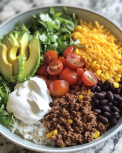 Easy Taco Rice Bowl – Quick and Healthy Dinner Idea is the kind of meal that brings bold flavor and satisfying texture together in a single bowl. Fluffy rice forms the base, topped with seasoned ground meat, fresh vegetables, and a creamy finish that ties everything together. Each bite offers warmth, gentle spice, and a refreshing crunch.