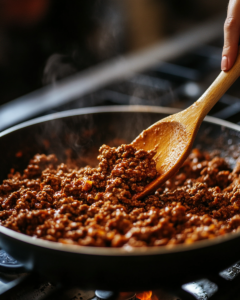 While the rice cooks, heat a skillet over medium heat. Add ground beef or your chosen protein. Break it apart with a wooden spoon as it browns. Cook until no pink remains and the meat develops light caramelization.