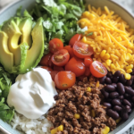 Easy Taco Rice Bowl – Quick and Healthy Dinner Idea is the kind of meal that brings bold flavor and satisfying texture together in a single bowl. Fluffy rice forms the base, topped with seasoned ground meat, fresh vegetables, and a creamy finish that ties everything together. Each bite offers warmth, gentle spice, and a refreshing crunch.