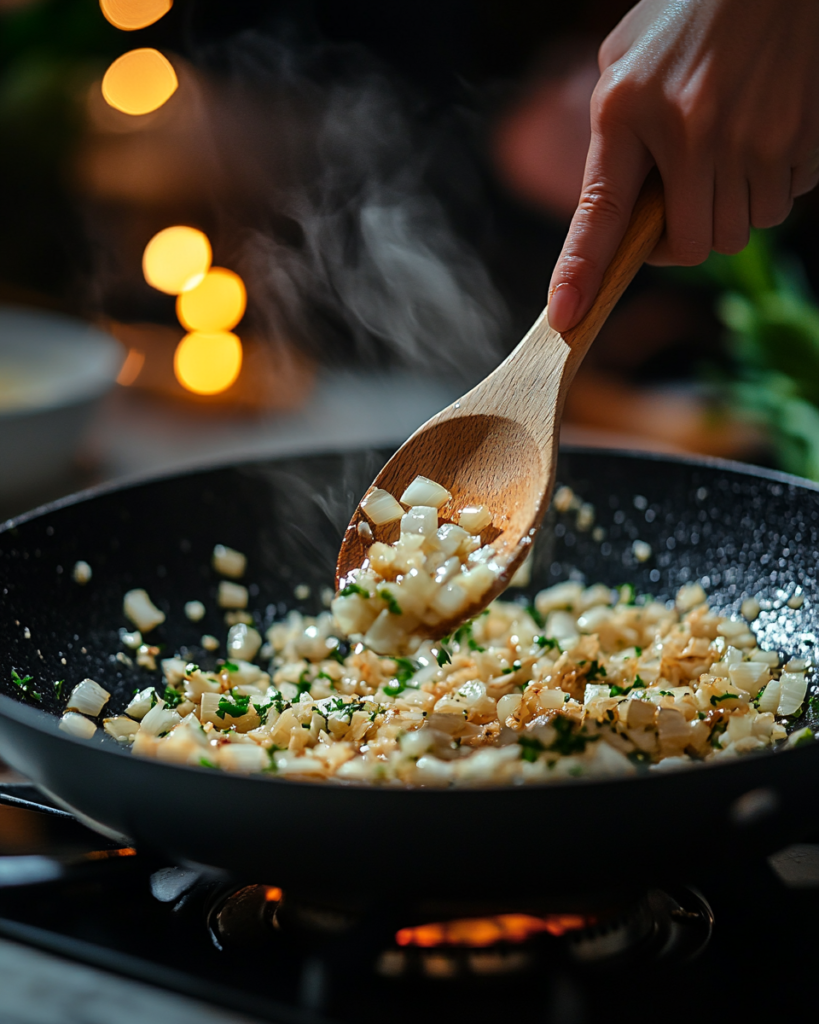 - In the same skillet, melt butter over medium heat. Add garlic and onion, sautéing until fragrant and translucent, about 3-4 minutes.