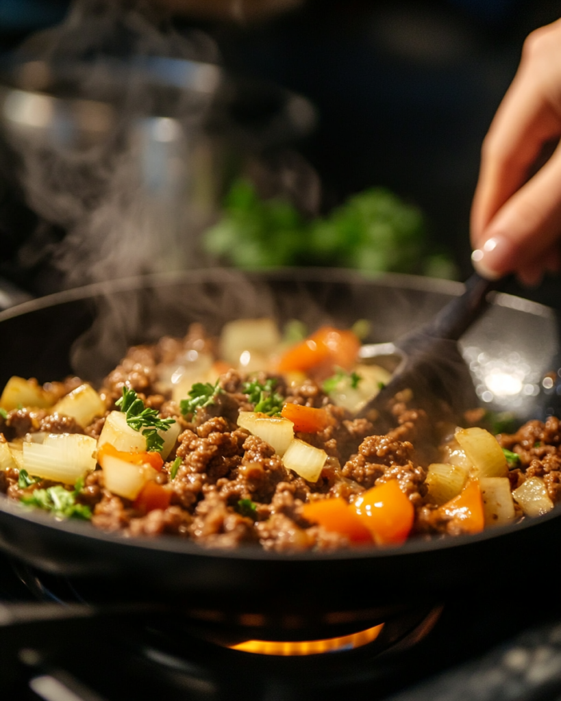 Heat the olive oil in a large skillet over medium heat. Add the ground beef and cook until browned, breaking it up with a spoon. Cook for 6–8 minutes until no pink remains. Drain excess fat if necessary to avoid a greasy sauce. - Sauté the aromatics
