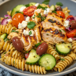 Juicy bites of seasoned chicken pair beautifully with briny olives, creamy feta, and sun-ripened tomatoes. The pasta absorbs the dressing, allowing every forkful to carry layers of flavor without feeling heavy.