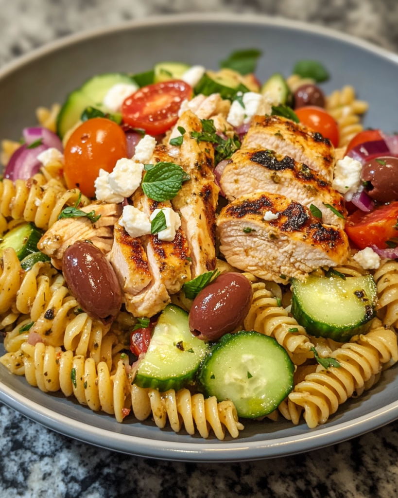 A hearty Mediterranean-inspired pasta salad with tender chicken, fresh vegetables, olives, feta, and a bright lemon olive oil dressing.
