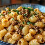 A comforting, creamy pasta dish featuring tender beef, pasta shells, and a rich, cheesy sauce—perfect for cozy dinners or family meals.