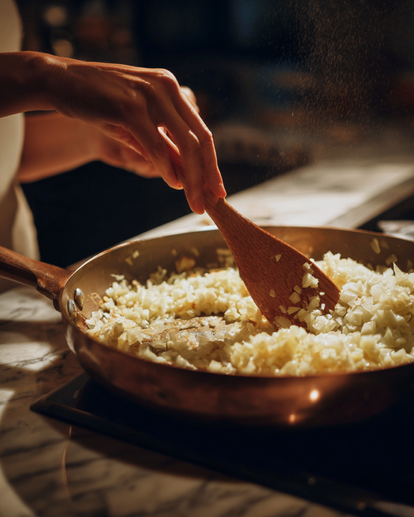Heat a large, deep pot over medium heat. Add the olive oil and allow it to warm for a few seconds. Add the finely chopped onion and sauté for 3 to 4 minutes, stirring occasionally, until the onion becomes soft and translucent. This step builds the foundation of flavor.